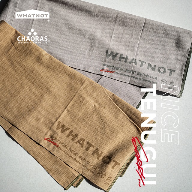 WHATNOTとCHAORASのコラボによるオリジナル手ぬぐいが、特別なカタチで再登場! 大好評で短い期間で完売した「ナイステヌグイ」ですが、実は生産時に規定サイズにわずかに満たなかったものが発生していました。 WHATNOTとしてはこれらを廃棄するという選択はできませんでした。 手ぬぐいとしての機能(防臭・抗菌機能や防虫加工等)にはまったく問題はなく、長さが僅かに短い(約-5cm)というだけ。 今回は想いを込めて、サイズ表記部分に「SORRY(寸足らずでごめんね)」と刺繍を施しました。 通常モデルと同様に、防臭・抗菌機能や防虫加工を施しており、アウトドアシーンでも快適。 綿100%のリップストップ生地を使用し、破れに強く乾きやすいため、日常使いからDIY、キャンプまで幅広く活躍します。 数量限定での販売となり、再販はありませんがこの機会にぜひお手に取ってみてください。 ⚫︎SPEC ・サイズ(約):w1,000×h350mm(数ミリ程度前後はご了承ください) ・素材:綿100%(リップストップ生地) ・機能:吸水・柔軟加工/防虫加工/抗菌・防臭加工 ・カラー:サンドベージュ/グレー ・生産国:日本 【ご注意】 ※在庫管理には細心の注意を払っておりますが、実店舗と在庫の共有をしていますので、同時に実店舗で売れてしまった場合などは、在庫有の表示の場合であっても、在庫切れとなる場合がございます。 その場合は当店よりご連絡を差し上げます。 ※PCディスプレイの性質上、実際の色と異なって見える場合がございますので予めご了承ください。