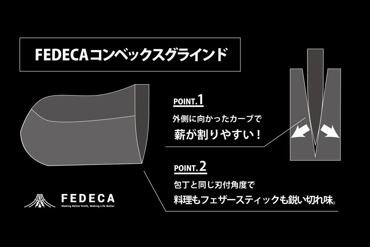 こだわり抜いた形状と5.6mmの極厚刃。そして包丁と同じ角度で刃付けしたFEDECA独自のコンベックスグラインドブレードで、バトニングによる薪割り&ファイヤースターターでの着火などタフな使用にも難なく耐えながら、フェザースティックや食材のカットなどの繊細な作業もこなしてしまう、まさに万能のブッシュクラフトナイフ。