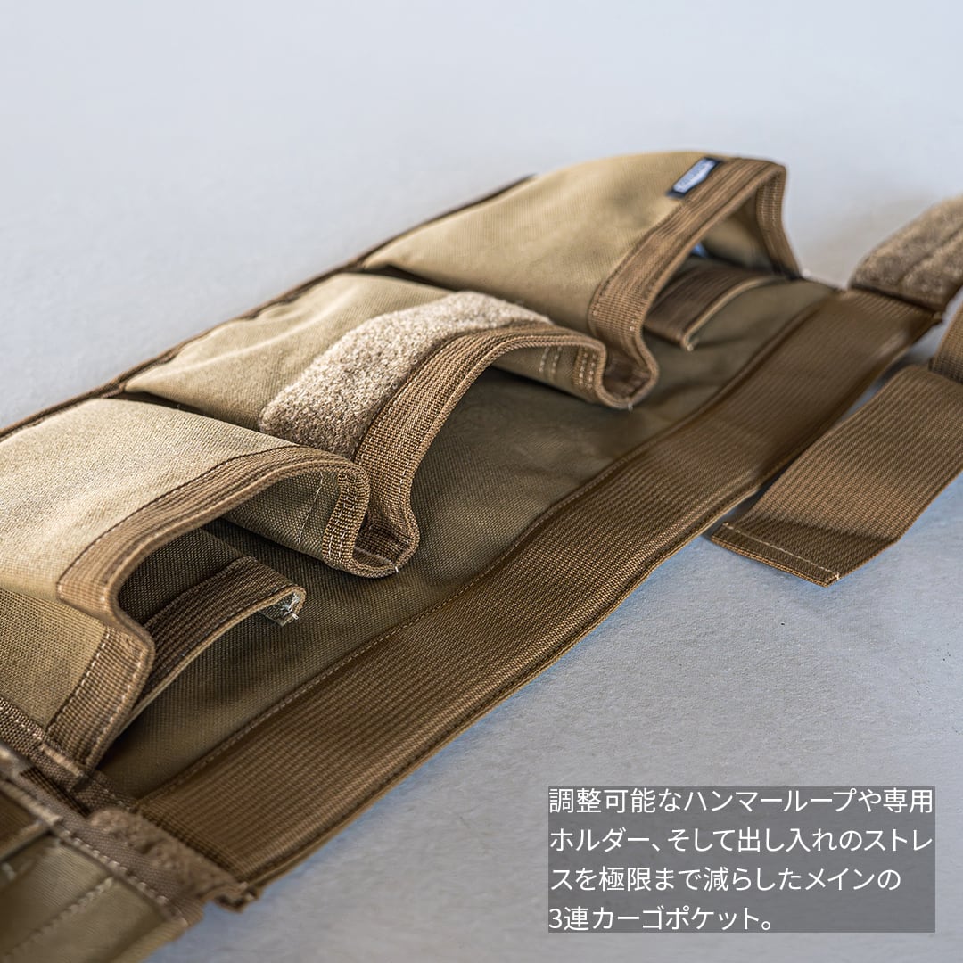 ・特徴:3連カーゴポケット、調整可能ハンマーループ、左右対応パッチベース