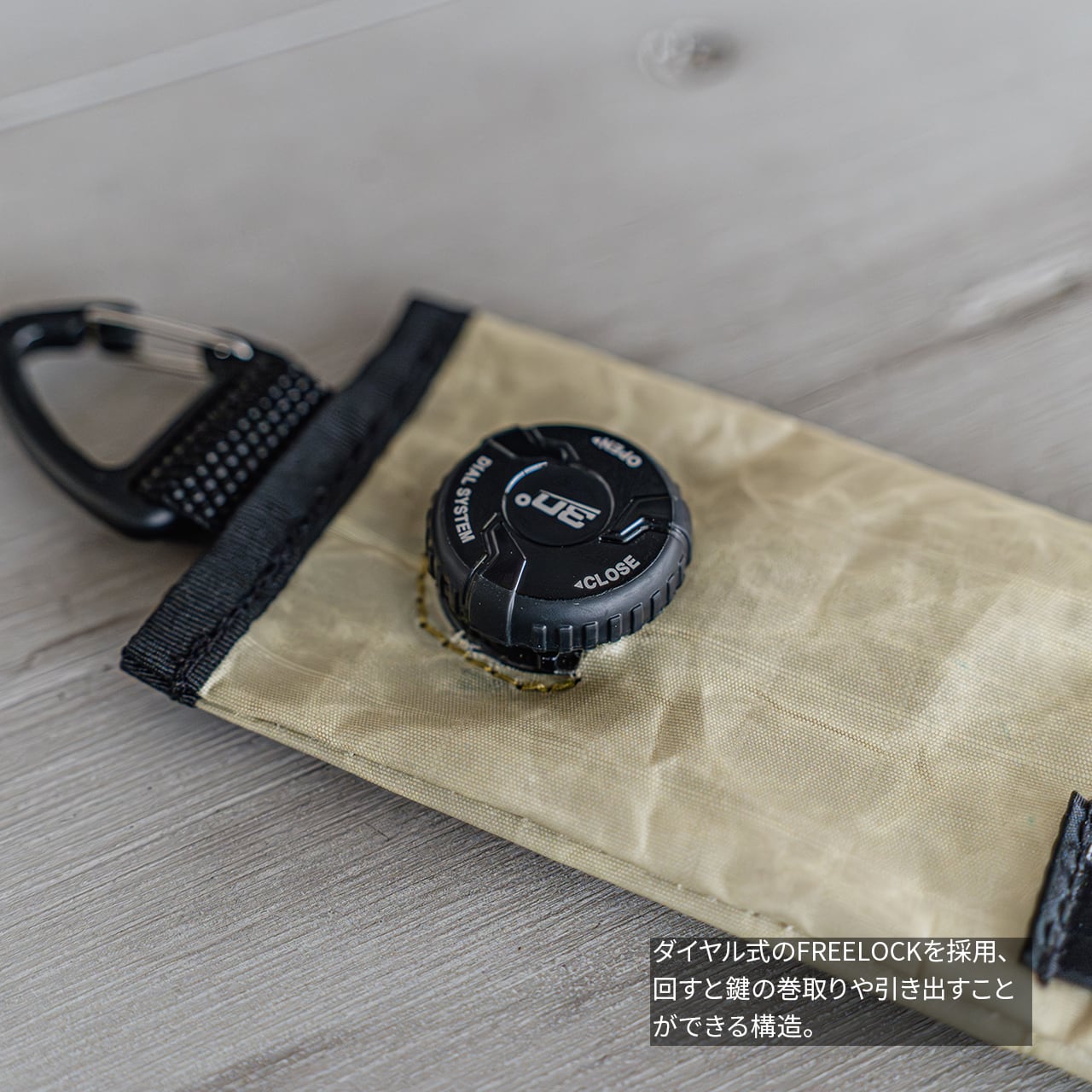 ダイヤル式のFREELOCKを採用し、パーツ本体を半時計回りに回すと解除され鍵を引き出すことができ、時計回りに回すことで鍵を巻き取る構造になっています。