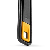 ハンドルは人間工学に基づいた幅広の「丸型Iビームハンドル」で、強い力をかける際も手が痛くなりにくく、長時間の作業でも快適に使用できます。また、柄の末端にはテザーループ(落下防止紐の取り付け穴)も備わっています。
