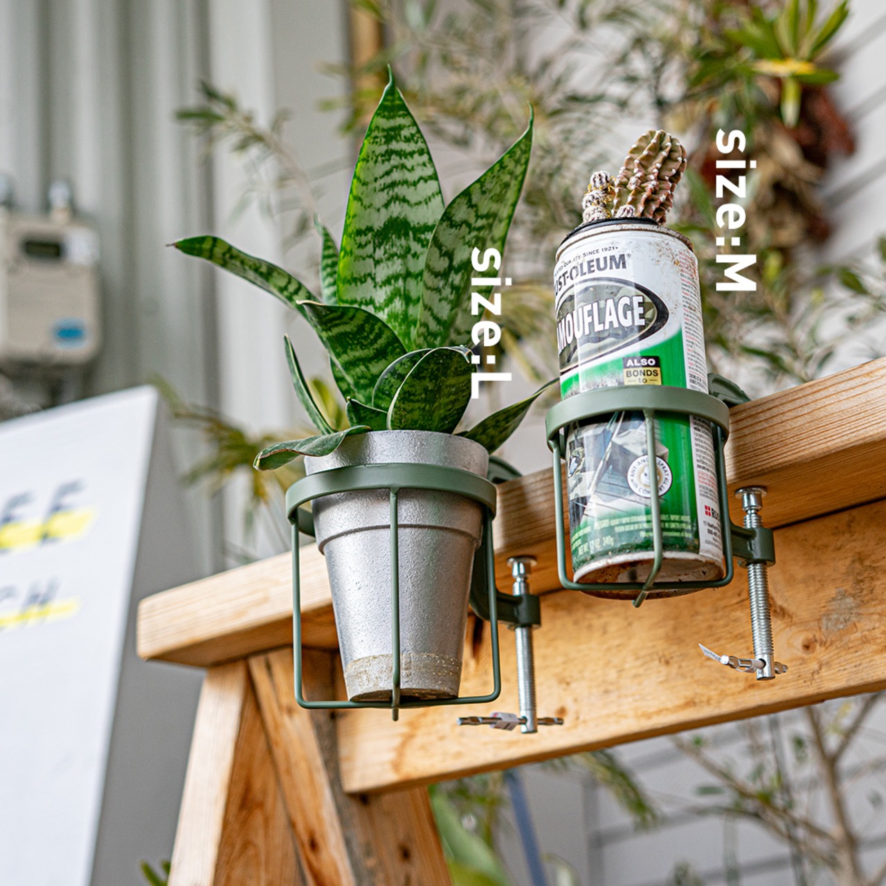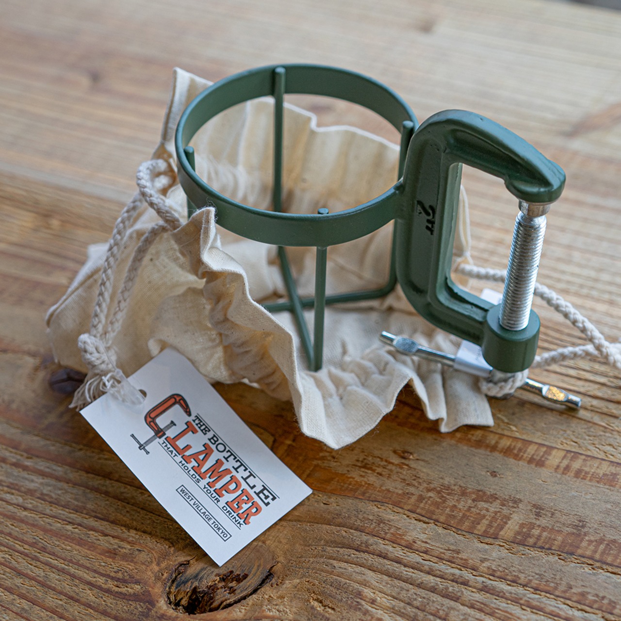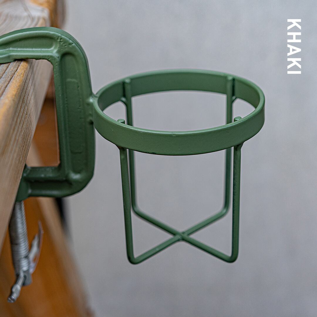 工具でお馴染みのCクランプにボトルホルダーを組み合わせ、テーブルや椅子のアームなどへ簡単に取り付けのできるボトルクランパー。