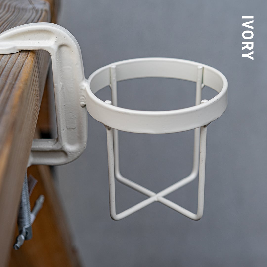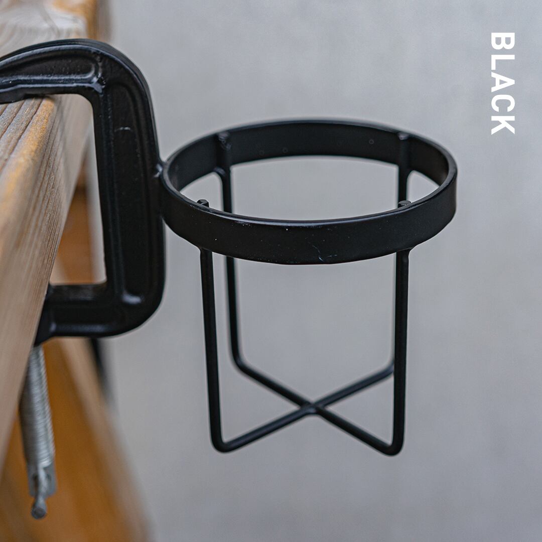 工具でお馴染みのCクランプにボトルホルダーを組み合わせ、テーブルや椅子のアームなどへ簡単に取り付けのできるボトルクランパー。