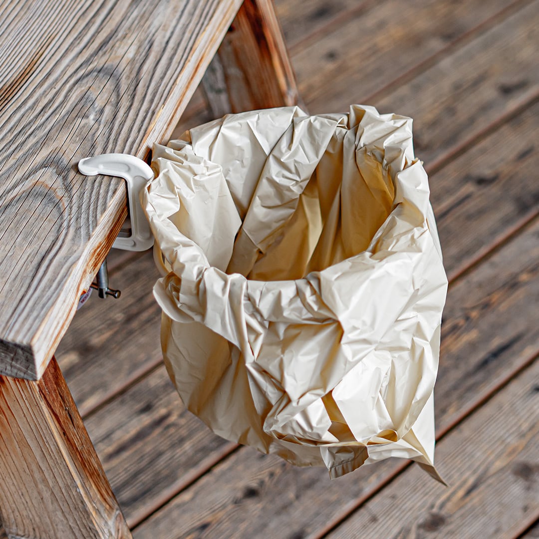 工具でお馴染みのCクランプにトラッシュリングを組み合わせ、テーブルや椅子のアームなどへ簡単に取り付けのできるトラッシュリングクランパー。